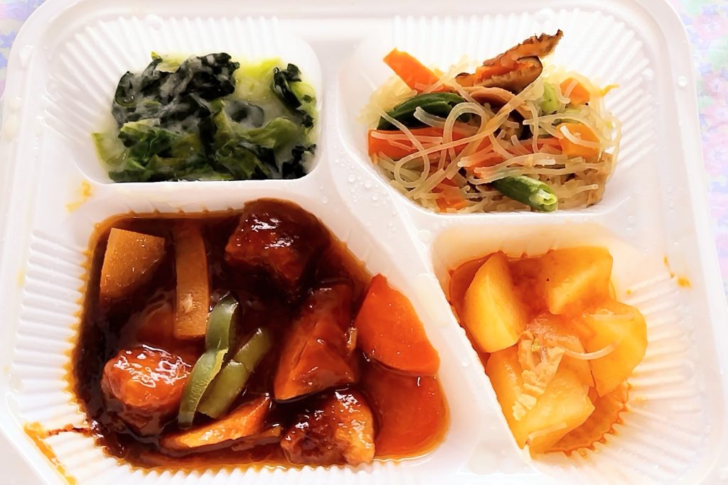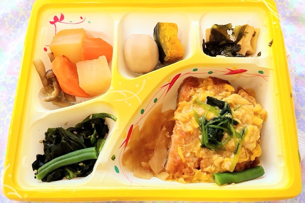 カツの卵とじ風は、味がしっかり染み込んでいて優しい味わいです。副菜も味がしっかりついていました。