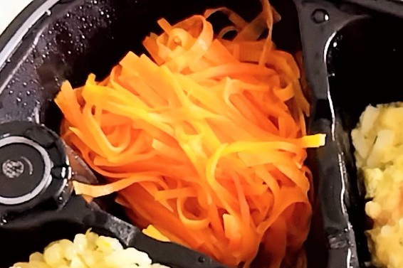 キャロットラペは、にんじんをオリーブオイルとビネガーであえてあり、混ぜて食べるとほどよい酸味が引き立ちます。